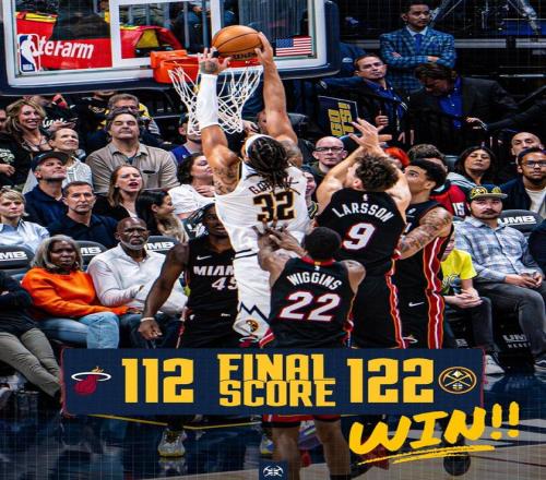 韦尔2罚全中,哈克斯在篮下得分,约基奇助攻小哈达威命中三分球。韦尔外线取分,约基奇2罚1中,随后勾手得分。掘金领先12分得以锁定大局,哈克斯上篮打进,鲍威尔2罚去找,约基奇助攻布劳恩暴扣。哈克斯上篮得手,穆雷2罚全中,距离终场仅剩32秒,热火落后10分并请求暂停。鲍威尔失误,最终,掘金以122比112力克热火,得以斩获2连胜。