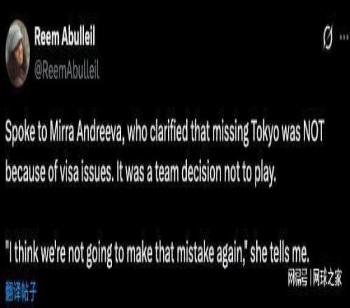 面对WTA年终总决赛前方记者的进一步提问,安德列娃明确表示,缺席东京站并非因为签证问题,而是团队内部共同商定的结果。